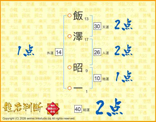 飯(13画)澤(17画) 昭(9画)一(1画)