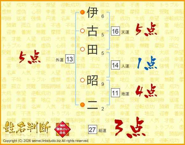 伊(6画)古(5画)田(5画) 昭(9画)二(2画)