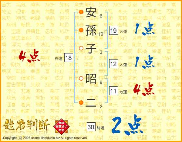 安(6画)孫(10画)子(3画) 昭(9画)二(2画)