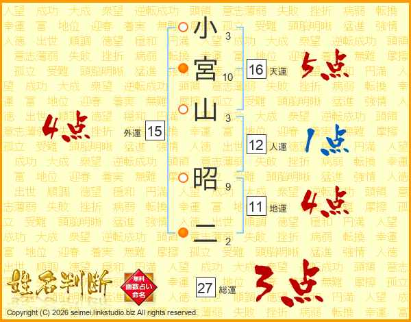 小(3画)宮(10画)山(3画) 昭(9画)二(2画)