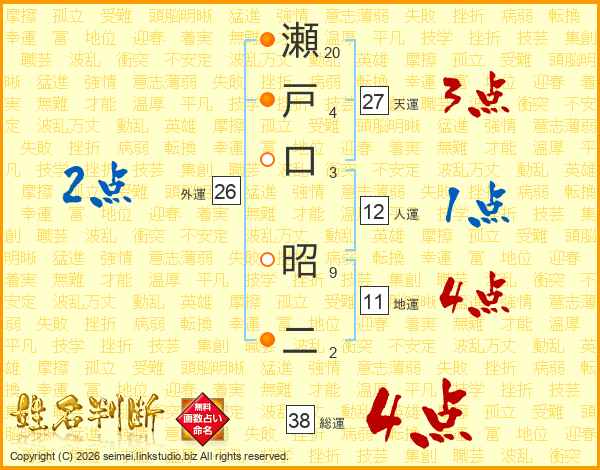 瀬(20画)戸(4画)口(3画) 昭(9画)二(2画)