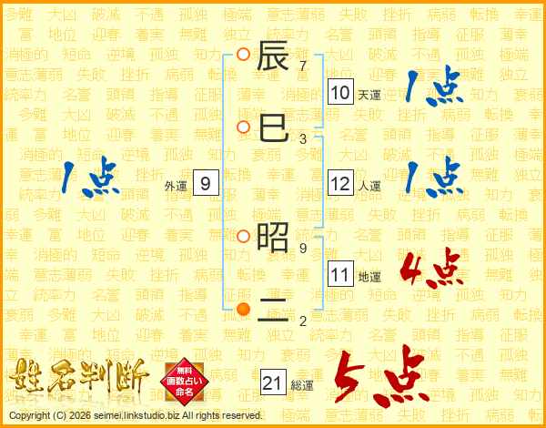 辰巳昭二さんの総運は21画の5点!