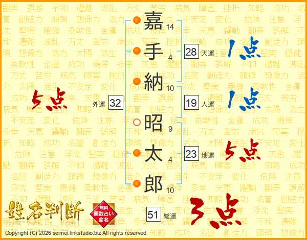 嘉(14画)手(4画)納(10画) 昭(9画)太(4画)郎(10画)