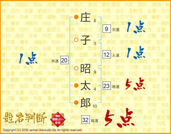 庄(6画)子(3画) 昭(9画)太(4画)郎(10画)