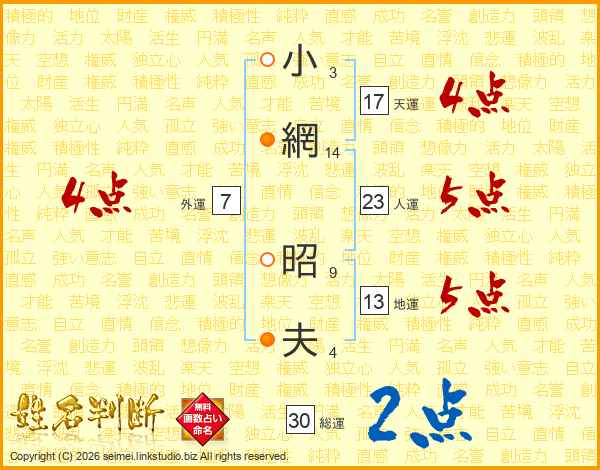 生活面を象徴する運勢です。外部から受ける影響力を表し、結婚運、家庭運や職場、環境への順応性を表します。総運から人運を引いた画数。姓や名が1文字の場合を除く。