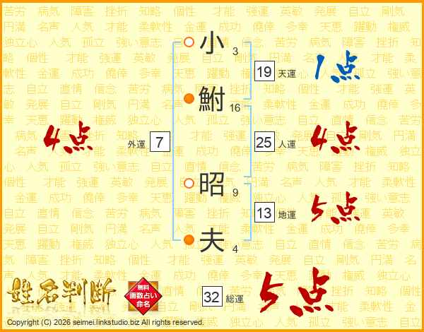 小鮒昭夫さんの総運は32画の5点!