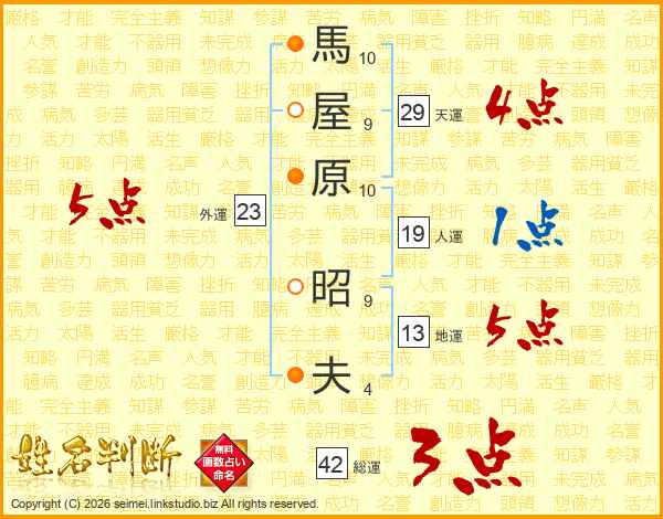 馬(10画)屋(9画)原(10画) 昭(9画)夫(4画)