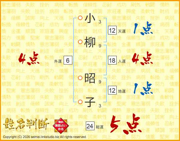 生活面を象徴する運勢です。外部から受ける影響力を表し、結婚運、家庭運や職場、環境への順応性を表します。総運から人運を引いた画数。姓や名が1文字の場合を除く。