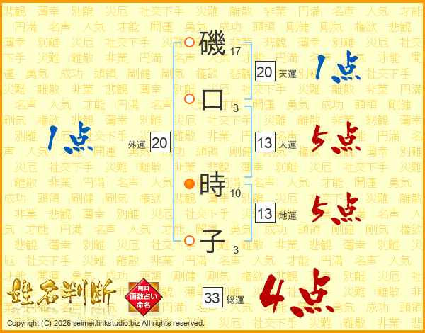 生活面を象徴する運勢です。外部から受ける影響力を表し、結婚運、家庭運や職場、環境への順応性を表します。総運から人運を引いた画数。姓や名が1文字の場合を除く。