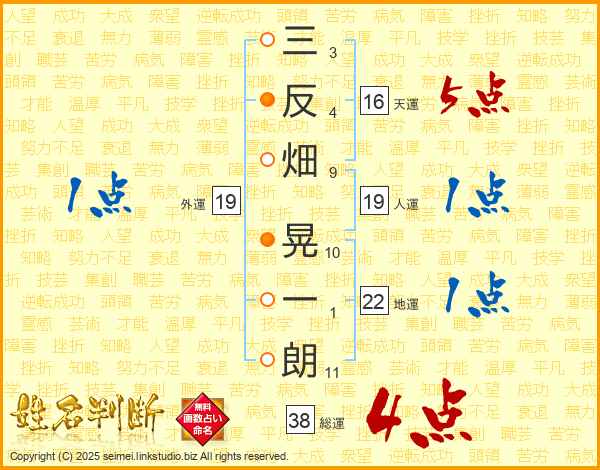 三(3画)反(4画)畑(9画) 晃(10画)一(1画)朗(11画)
