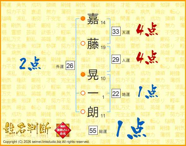 嘉(14画)藤(19画) 晃(10画)一(1画)朗(11画)