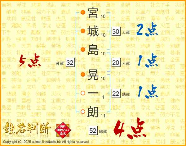 宮(10画)城(10画)島(10画) 晃(10画)一(1画)朗(11画)