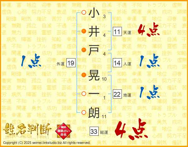 小(3画)井(4画)戸(4画) 晃(10画)一(1画)朗(11画)