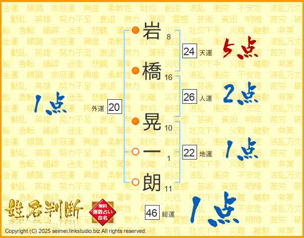 岩(8画)橋(16画) 晃(10画)一(1画)朗(11画)