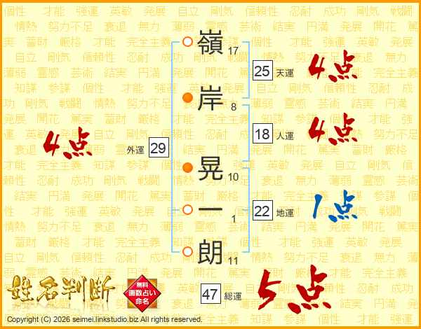 嶺(17画)岸(8画) 晃(10画)一(1画)朗(11画)