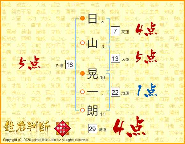 日(4画)山(3画) 晃(10画)一(1画)朗(11画)