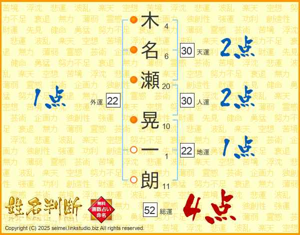 木(4画)名(6画)瀬(20画) 晃(10画)一(1画)朗(11画)
