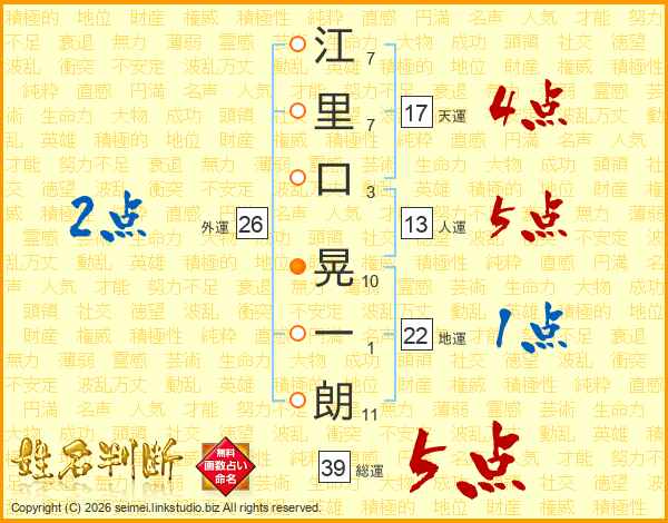 生活面を象徴する運勢です。外部から受ける影響力を表し、結婚運、家庭運や職場、環境への順応性を表します。総運から人運を引いた画数。姓や名が1文字の場合を除く。
