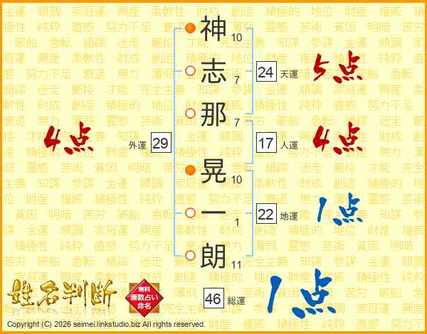 神(10画)志(7画)那(7画) 晃(10画)一(1画)朗(11画)
