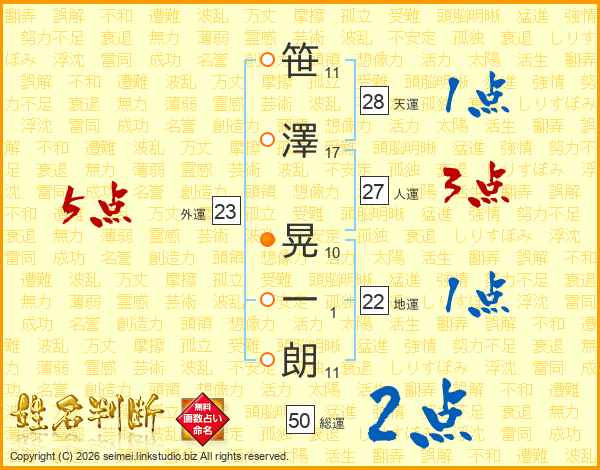 笹(11画)澤(17画) 晃(10画)一(1画)朗(11画)