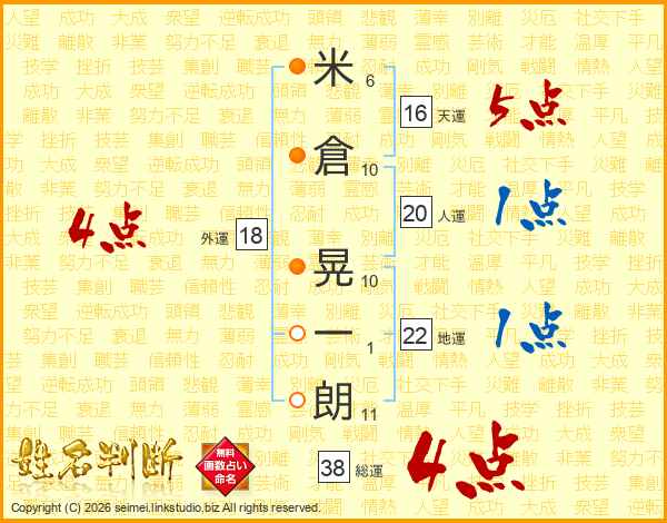 米(6画)倉(10画) 晃(10画)一(1画)朗(11画)