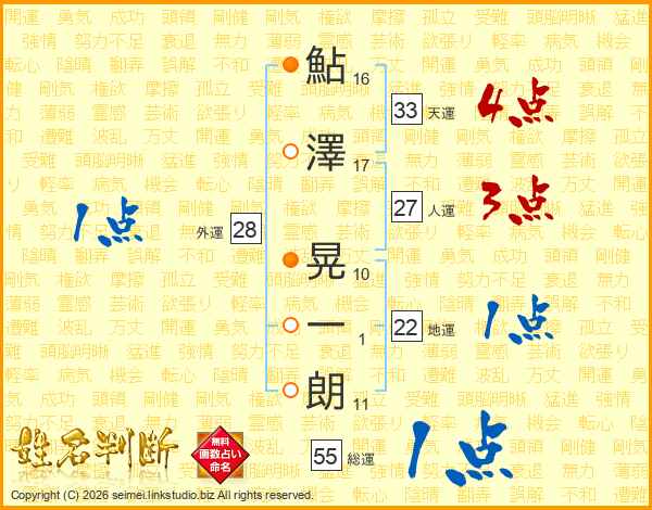 鮎(16画)澤(17画) 晃(10画)一(1画)朗(11画)
