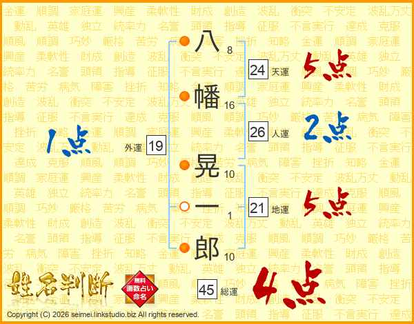 八(8画)幡(16画) 晃(10画)一(1画)郎(10画)