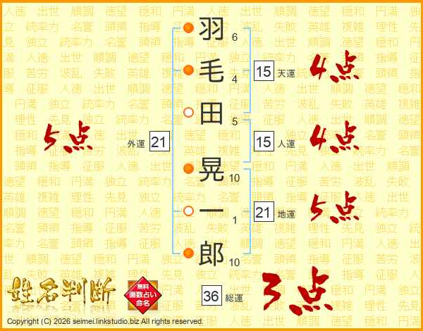 羽(6画)毛(4画)田(5画) 晃(10画)一(1画)郎(10画)