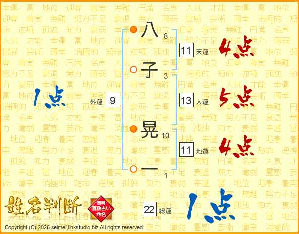 生活面を象徴する運勢です。外部から受ける影響力を表し、結婚運、家庭運や職場、環境への順応性を表します。総運から人運を引いた画数。姓や名が1文字の場合を除く。