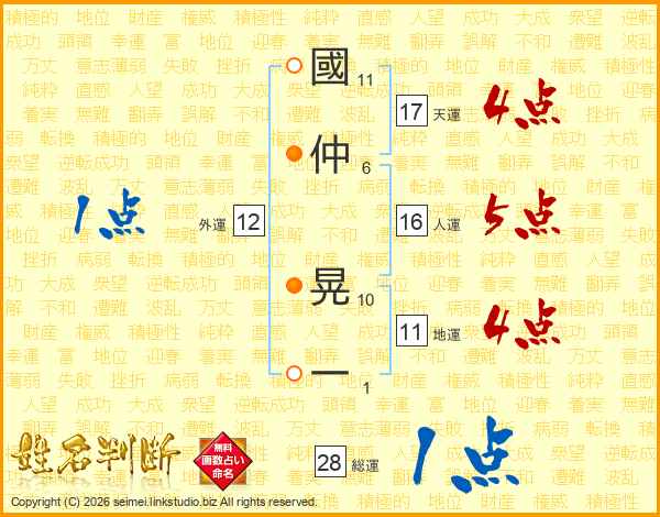 國(11画)仲(6画) 晃(10画)一(1画)