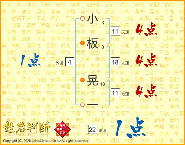 生活面を象徴する運勢です。外部から受ける影響力を表し、結婚運、家庭運や職場、環境への順応性を表します。総運から人運を引いた画数。姓や名が1文字の場合を除く。