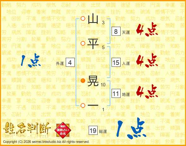 生活面を象徴する運勢です。外部から受ける影響力を表し、結婚運、家庭運や職場、環境への順応性を表します。総運から人運を引いた画数。姓や名が1文字の場合を除く。