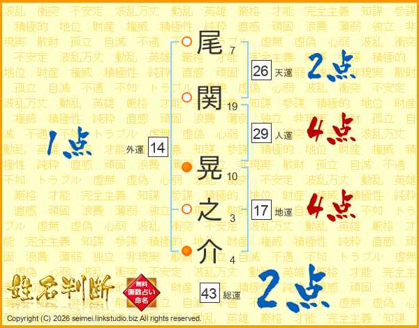尾(7画)関(19画) 晃(10画)之(3画)介(4画)