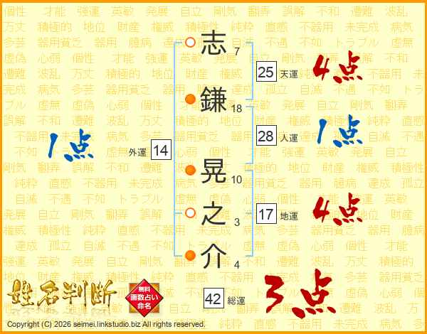 志(7画)鎌(18画) 晃(10画)之(3画)介(4画)