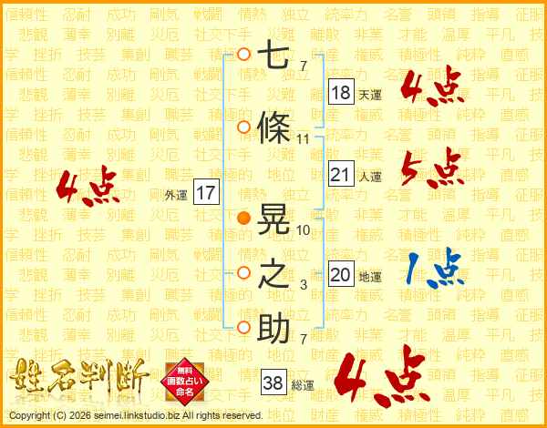 七(7画)條(11画) 晃(10画)之(3画)助(7画)
