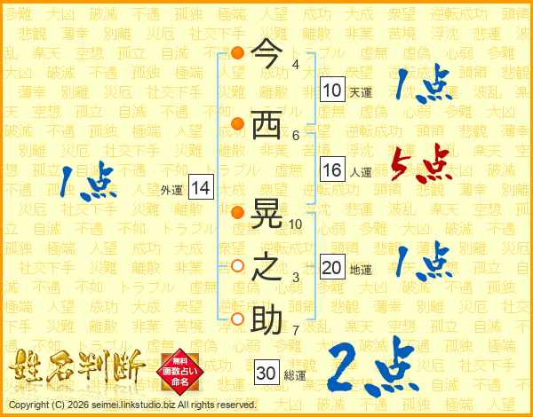 今(4画)西(6画) 晃(10画)之(3画)助(7画)