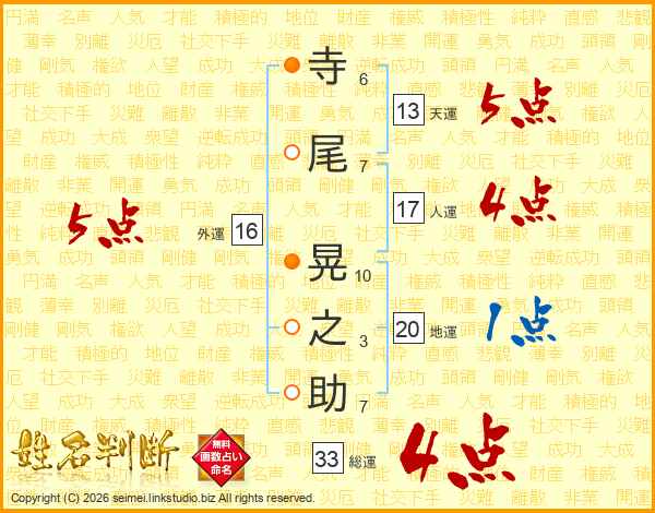 寺(6画)尾(7画) 晃(10画)之(3画)助(7画)