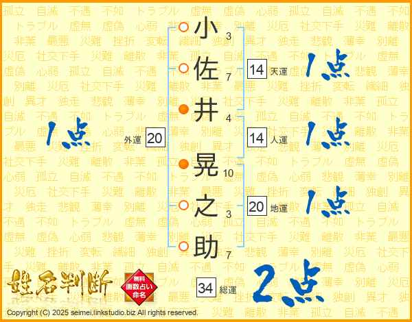 小(3画)佐(7画)井(4画) 晃(10画)之(3画)助(7画)
