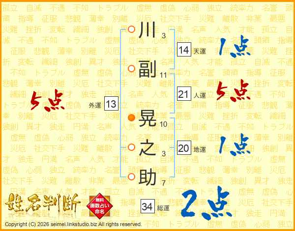 川(3画)副(11画) 晃(10画)之(3画)助(7画)