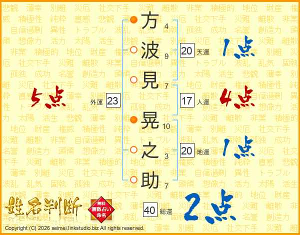 方(4画)波(9画)見(7画) 晃(10画)之(3画)助(7画)