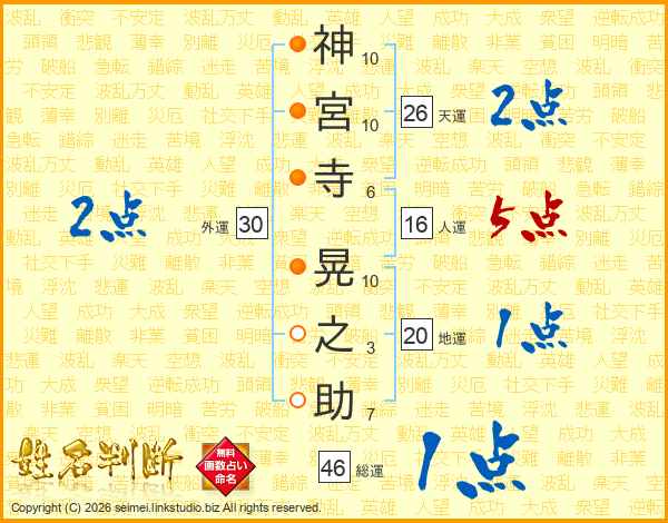 神(10画)宮(10画)寺(6画) 晃(10画)之(3画)助(7画)