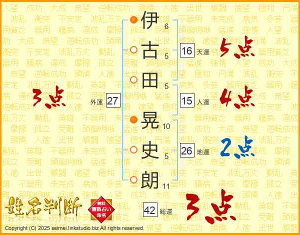 伊(6画)古(5画)田(5画) 晃(10画)史(5画)朗(11画)
