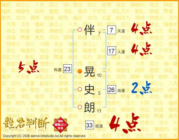 伴(7画) 晃(10画)史(5画)朗(11画)