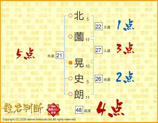 北(5画)薗(17画) 晃(10画)史(5画)朗(11画)