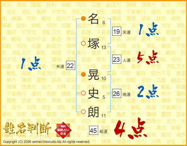 名(6画)塚(13画) 晃(10画)史(5画)朗(11画)