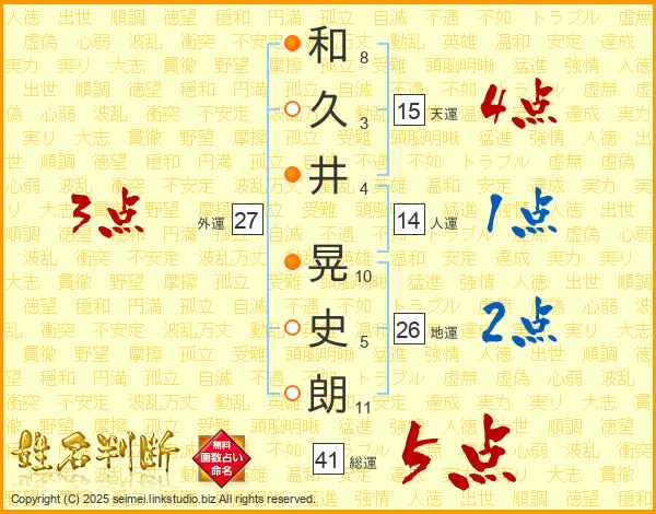 和(8画)久(3画)井(4画) 晃(10画)史(5画)朗(11画)
