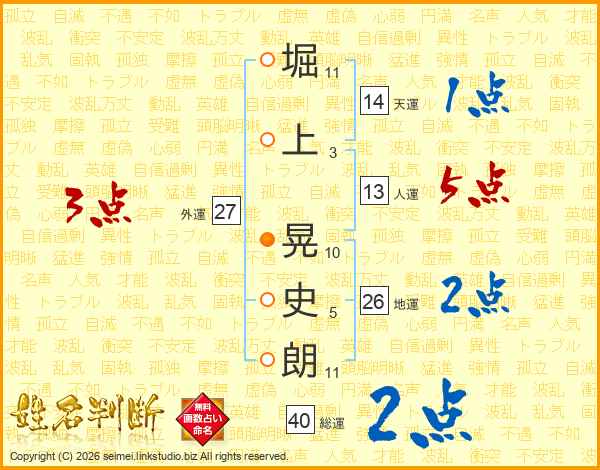 堀(11画)上(3画) 晃(10画)史(5画)朗(11画)