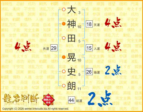 大神田晃史朗さんの総運は44画の2点!
