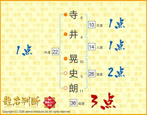 寺(6画)井(4画) 晃(10画)史(5画)朗(11画)
