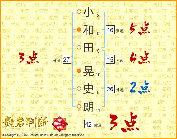 小(3画)和(8画)田(5画) 晃(10画)史(5画)朗(11画)